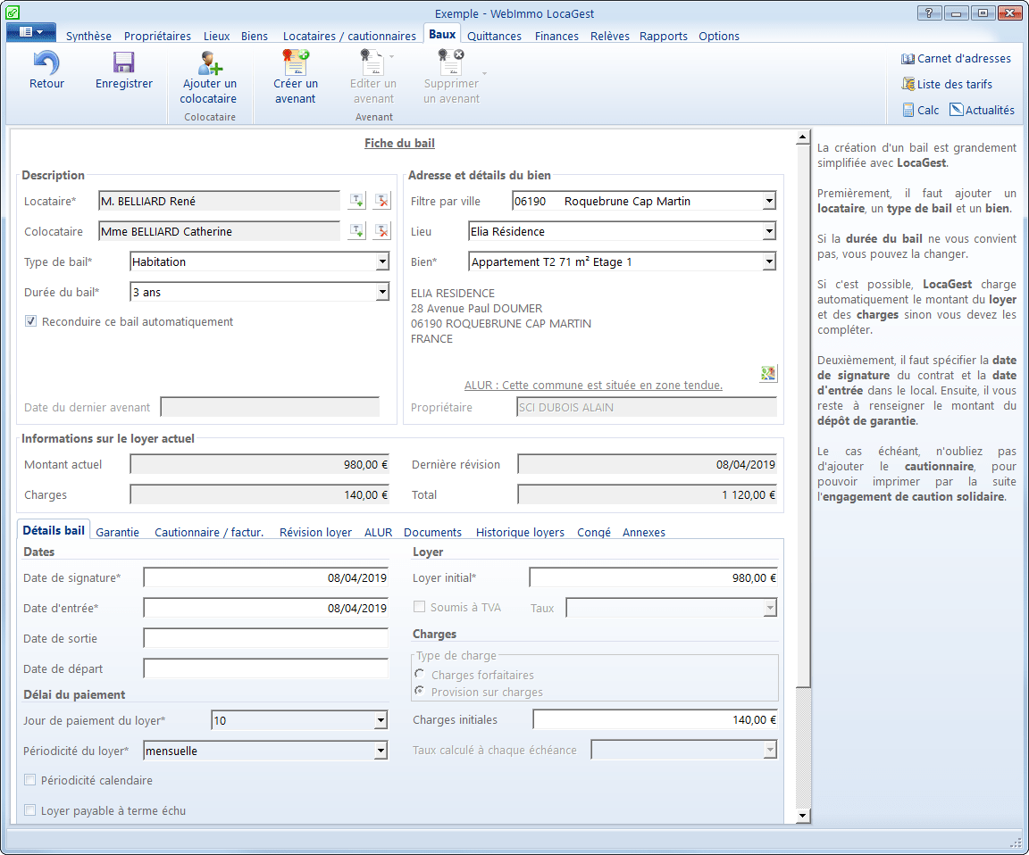 Selon vos choix, LocaGest vous assistera pour compléter automatiquement la fiche du bail. Il vous guide pour renseigner le bail sur sa durée, le loyer, les charges, le jour de paiement etc.