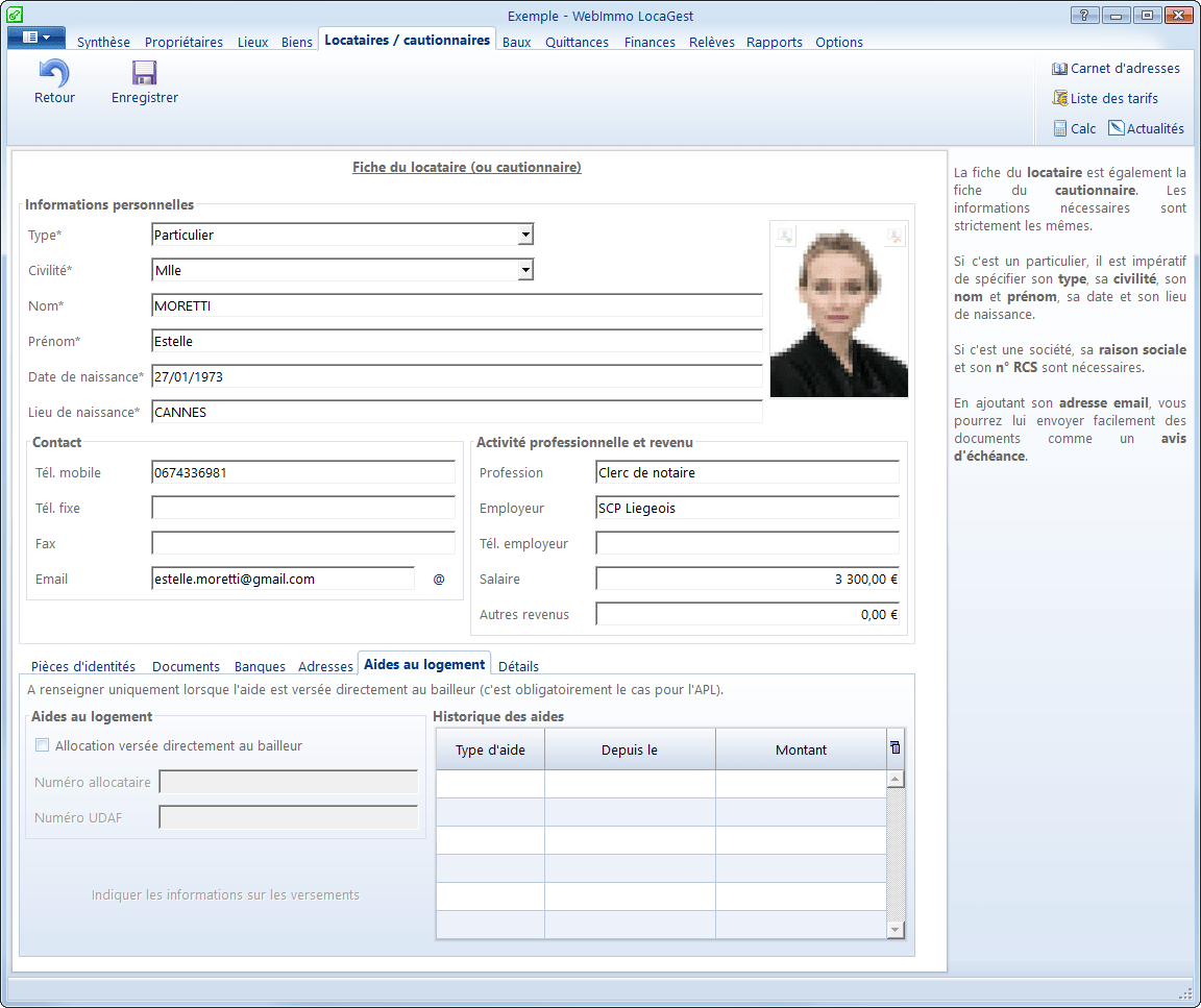 Cette rubrique recense la liste de vos locataires. Elle permet de gérer les locataires, les cautionnaires et les candidats à la location. La fiche du bien renseigne sur les informations personnelles du locataire et de sa situation professionnelle.
